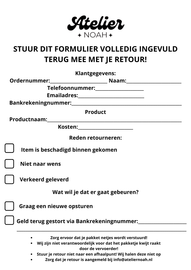 Ja, dat is mogelijk. Als de items niet naar wens zijn, mogen ze geretourneerd worden, mits ze ongebruikt zijn en niet beschadigd zijn door de koper. Is een item beschadigd bij ontvangst? Neem dan binnen 24 uur na ontvangst contact met ons op via info@ateliernoah.nl.